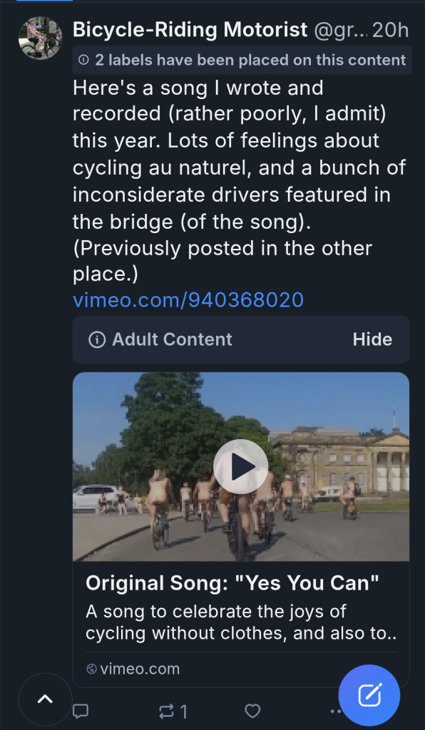 In another example, I included directly in a post a video of myself cycling past the camera without clothes on and self-labelled it as Non-sexual Nudity: