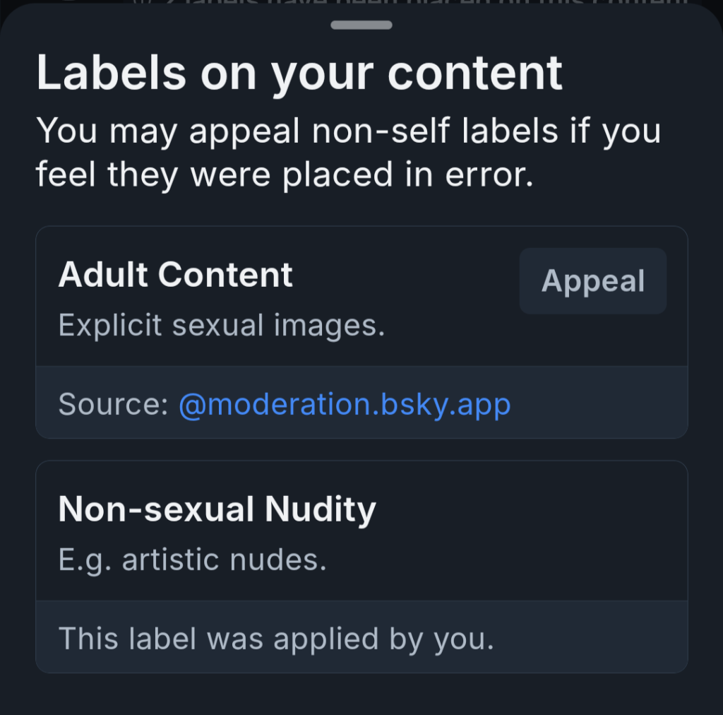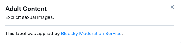 Immediately after the upload completed, the Bluesky moderation service added another label, flagged in the app screen as “Adult content” which, on closer inspection, means “Explicit sexual images”. This is what you get when you click on the text about labels at the top of the post: